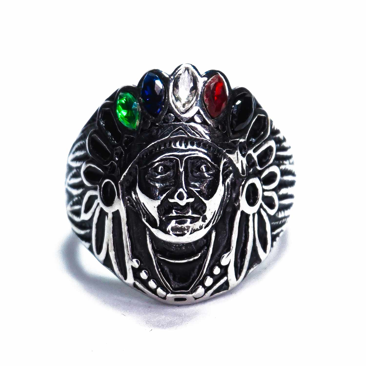 Anillo con diseño de nativo americano, con diseño de piedras zirconia de colores, elaborado en acero inoxidable, con envío a toda la república mexicana de 3 a 4 días hábiles.